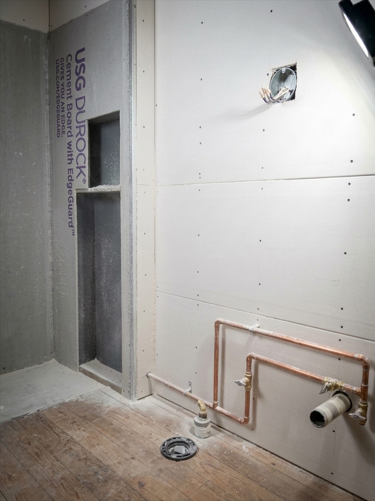 A flawless finish starts behind the walls. We execute precise plumbing rough-ins, re-routes, and multi-stage cement board waterproofing to guarantee zero moisture intrusion.